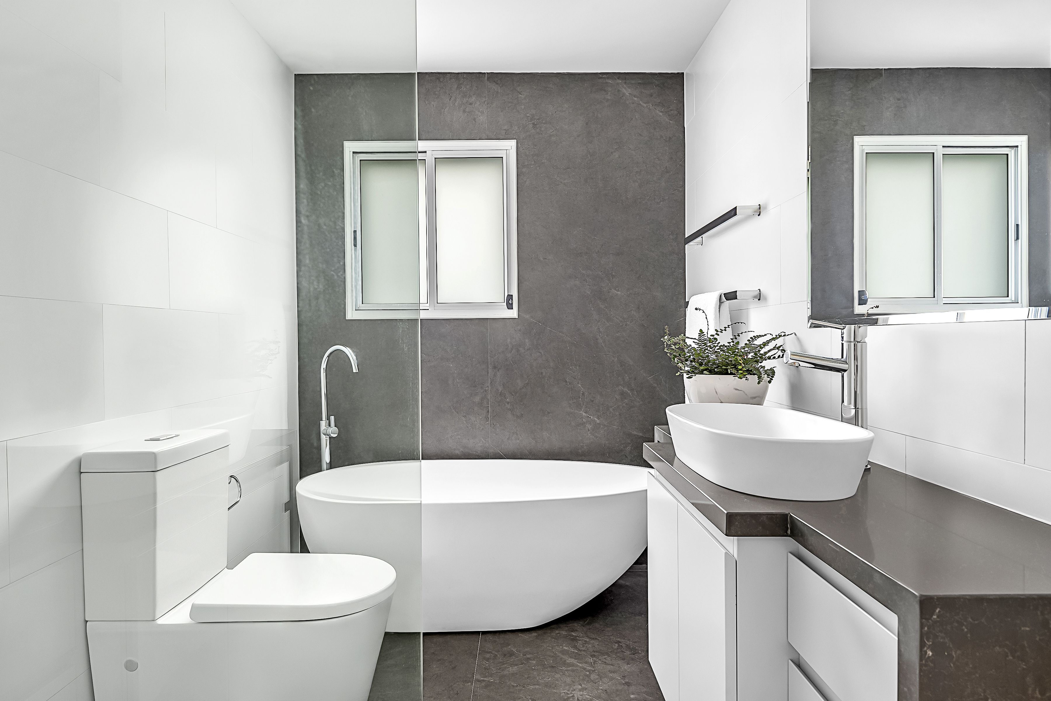 - Modern bathroom with chic standalone tub plus rainshower