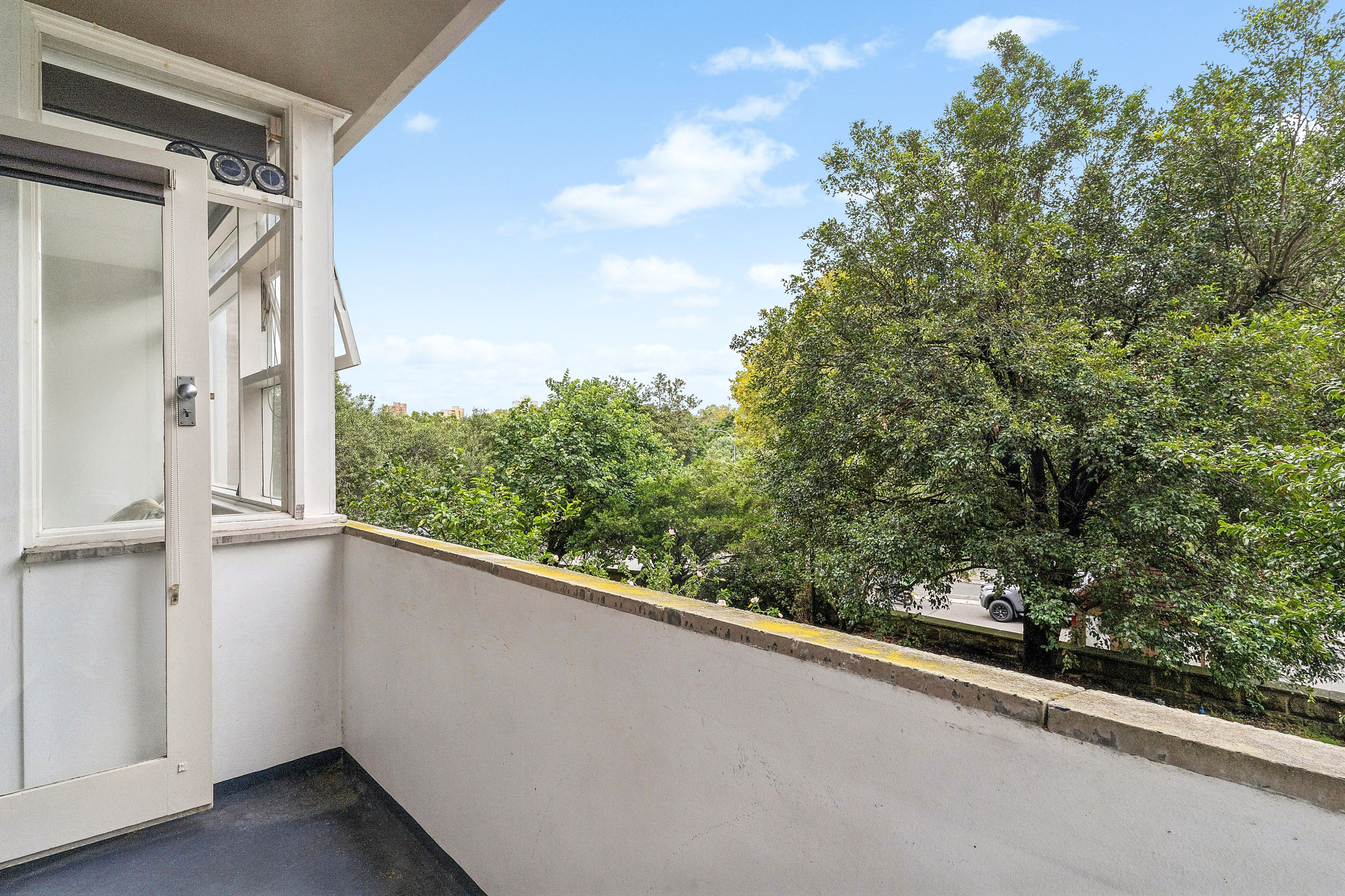 Offering a functional and versatile studio floorplan, the light-filled living area flows to a covered balcony with peaceful treetop outlooks. The updated kitchen includes gas cooking, while the renovated ensuite bathroom features mirrored storage cabinetry and a freestanding shower. Residents enjoy lift access or an easy walk up to the first-floor apartment.