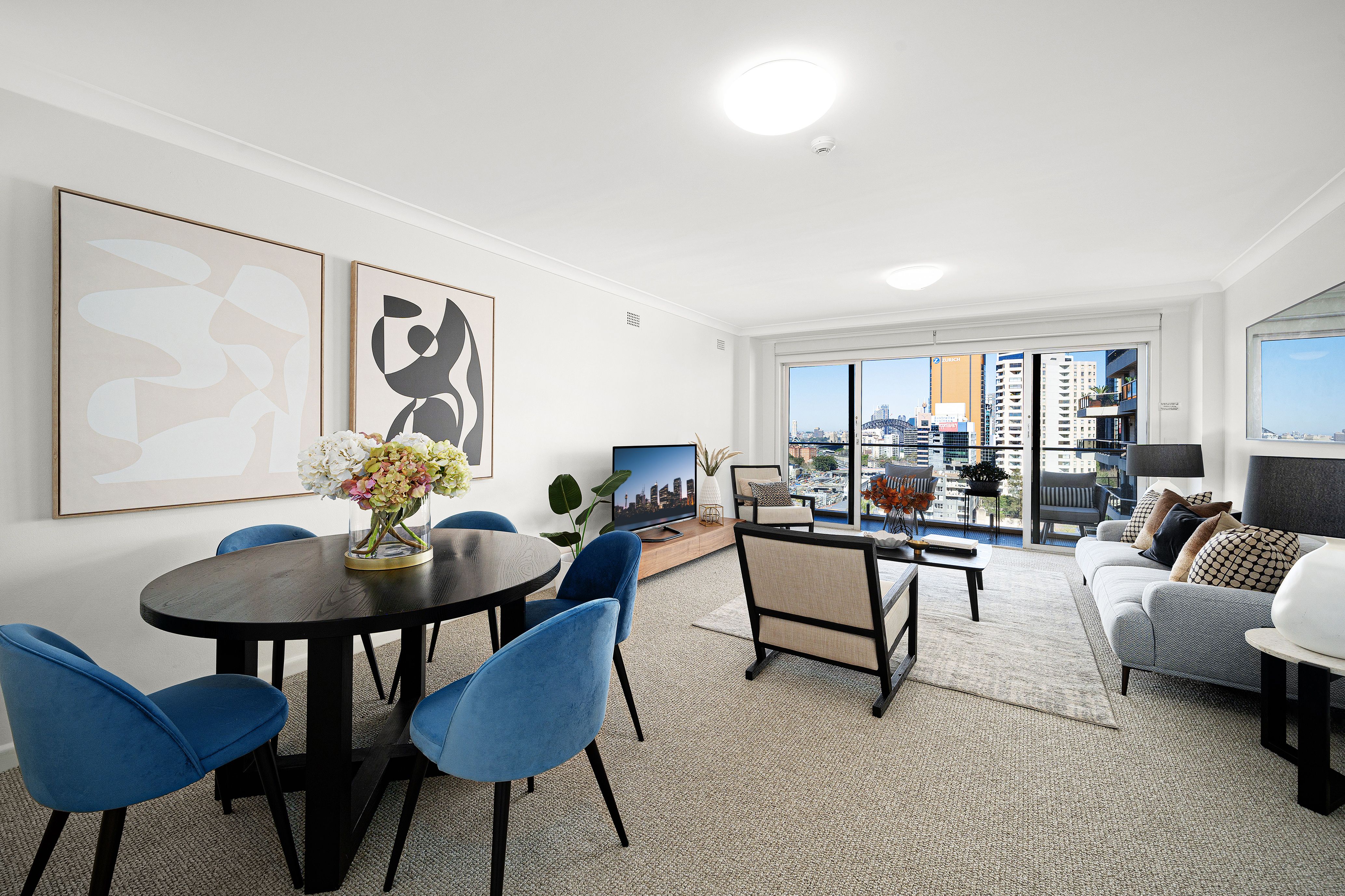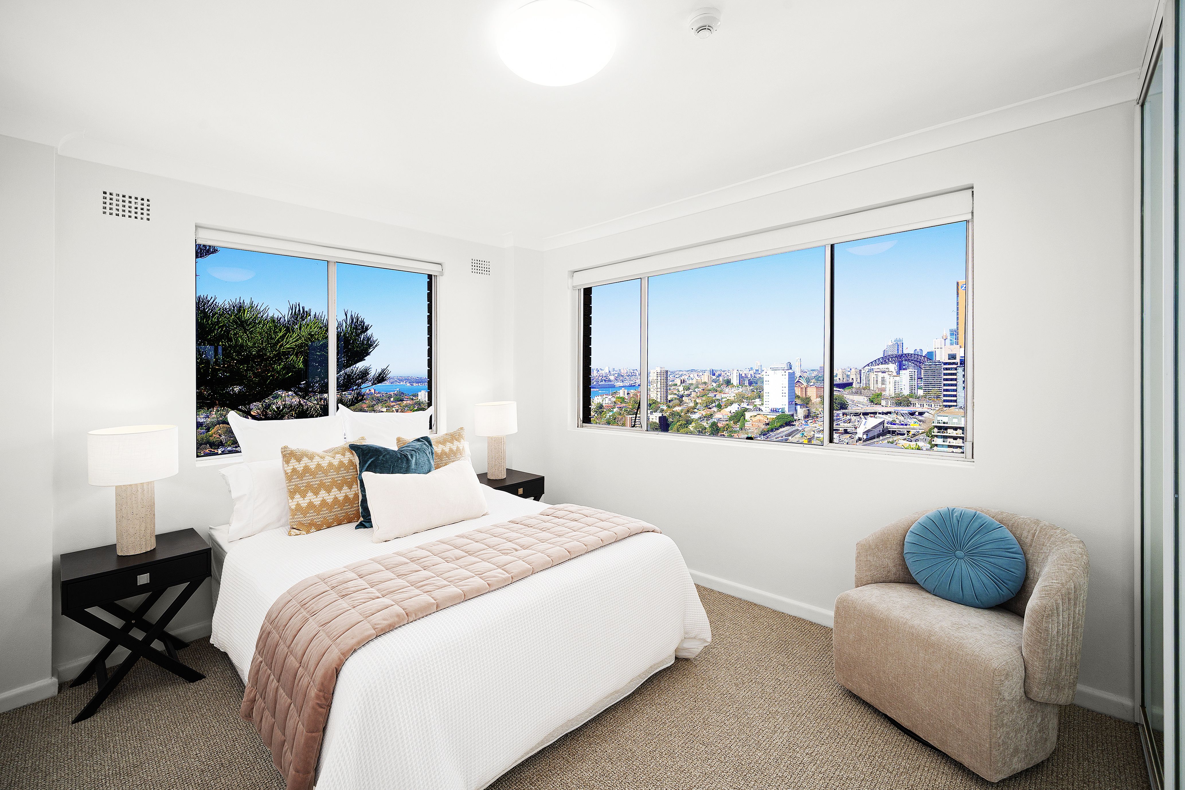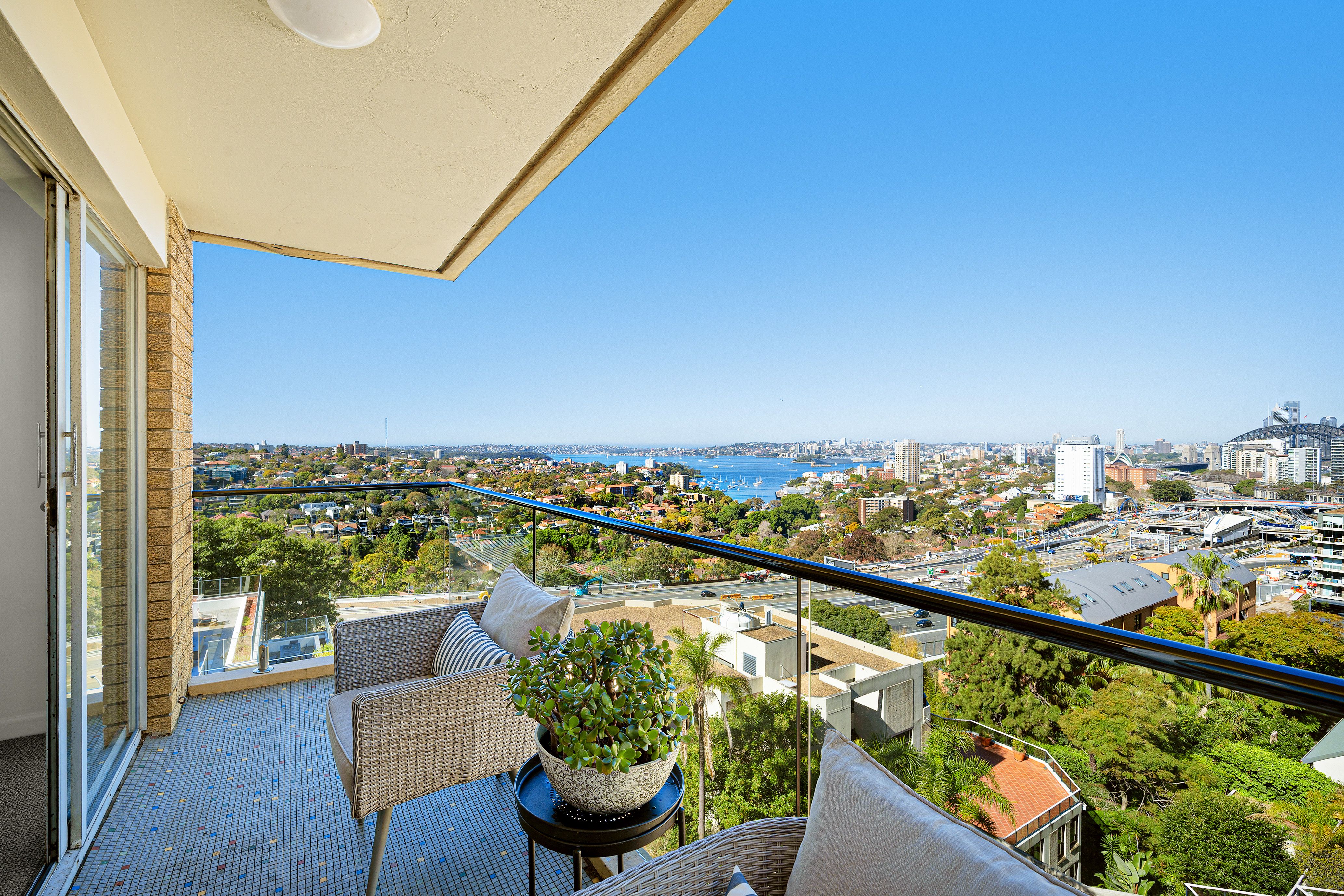 Set high on level six of a tightly held security building, this three-bedroom apartment enjoys an elevated position with sparkling views over Sydney Harbour, the Opera House and Harbour Bridge. Freshly updated and filled with natural light, it offers a practical layout with no common walls, spacious interiors, and a covered balcony for enjoying the city skyline from home.