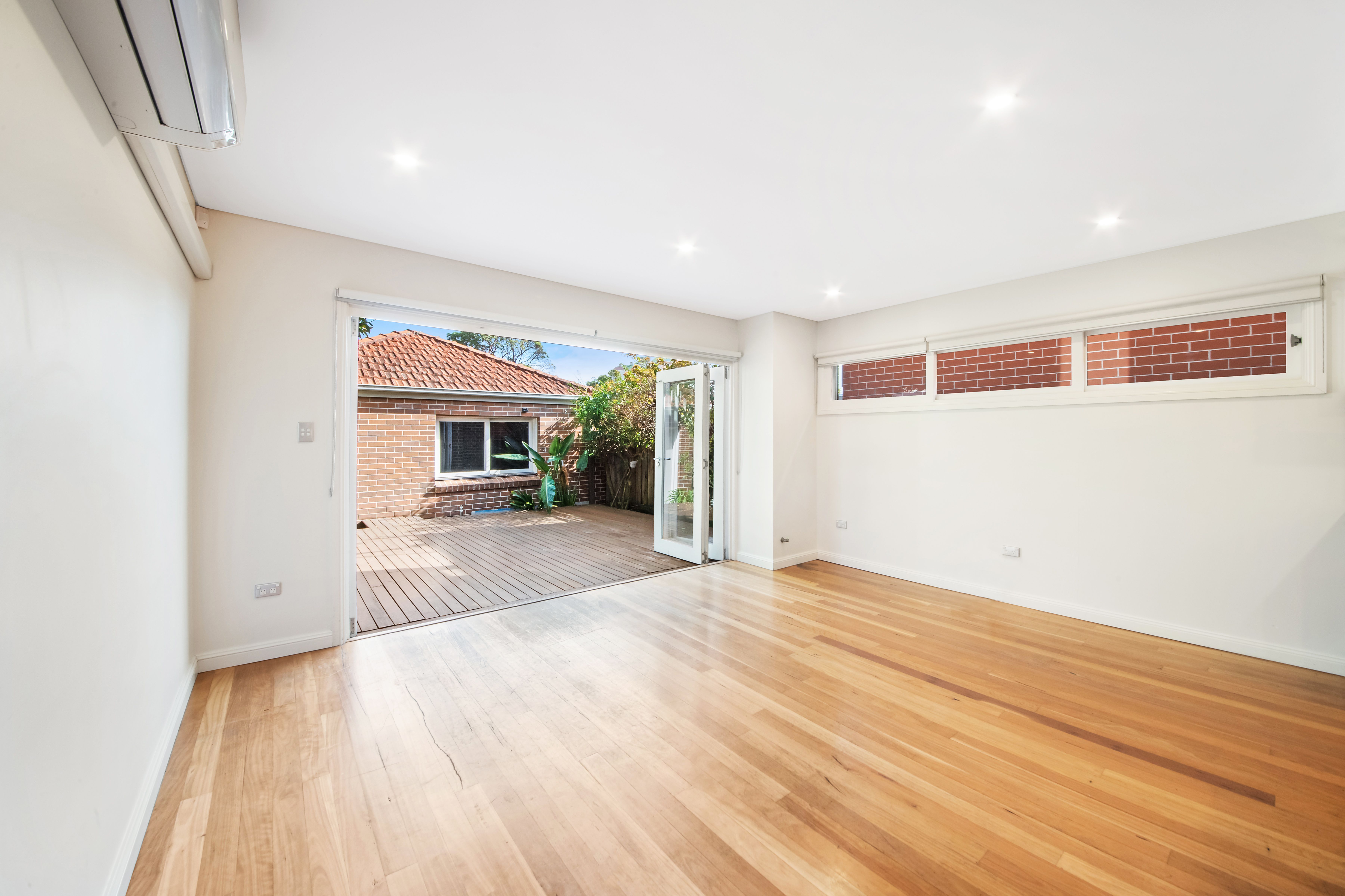 - Expansive open-plan living room with air conditioner and dining opening to outdoor entertaining spaces