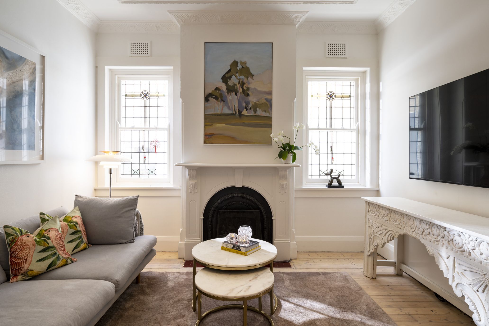 - Elegant living room with gas fireplace, polished timber floors and ornate ceilings