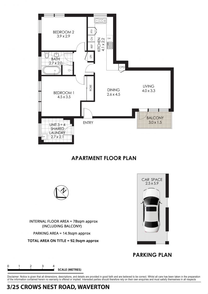 Total area on title: 92.9sqm (internal areas of 73.4sqm, the balcony of 4.6sqm and the garage of 14.9sqm)