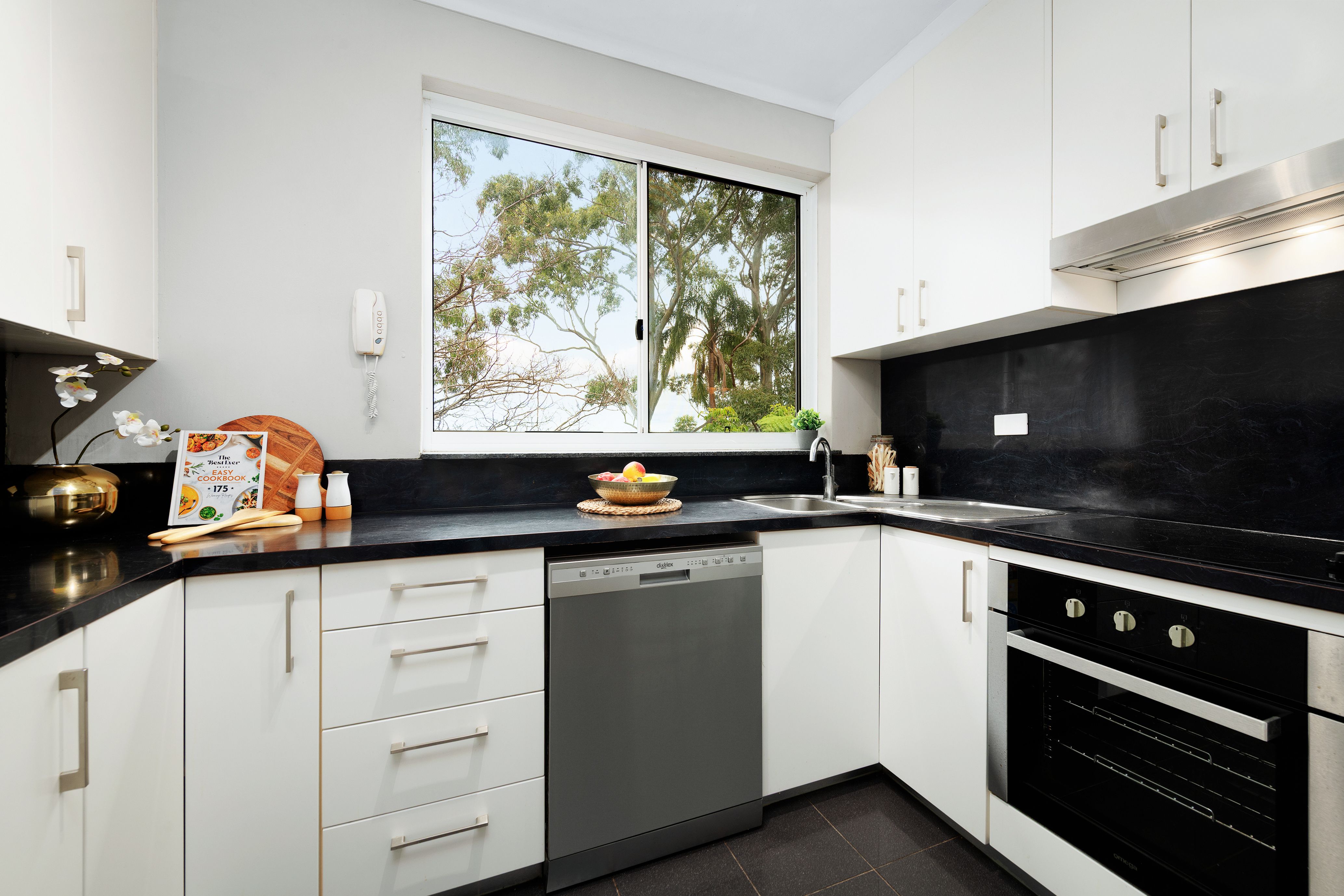 - Sleek kitchen with dishwasher, framed by a sunny window