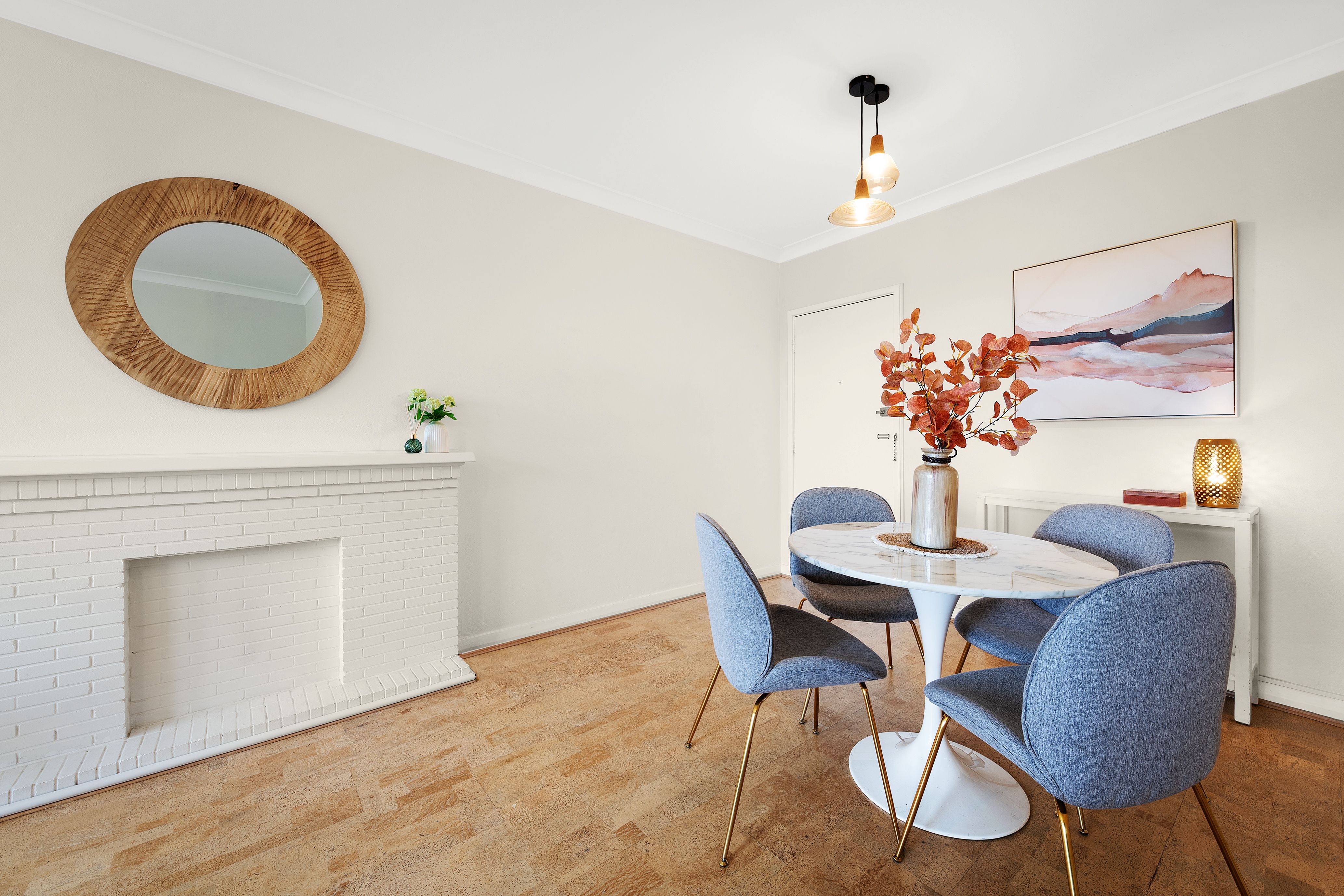- Open-plan living and dining features an ornamental fireplace