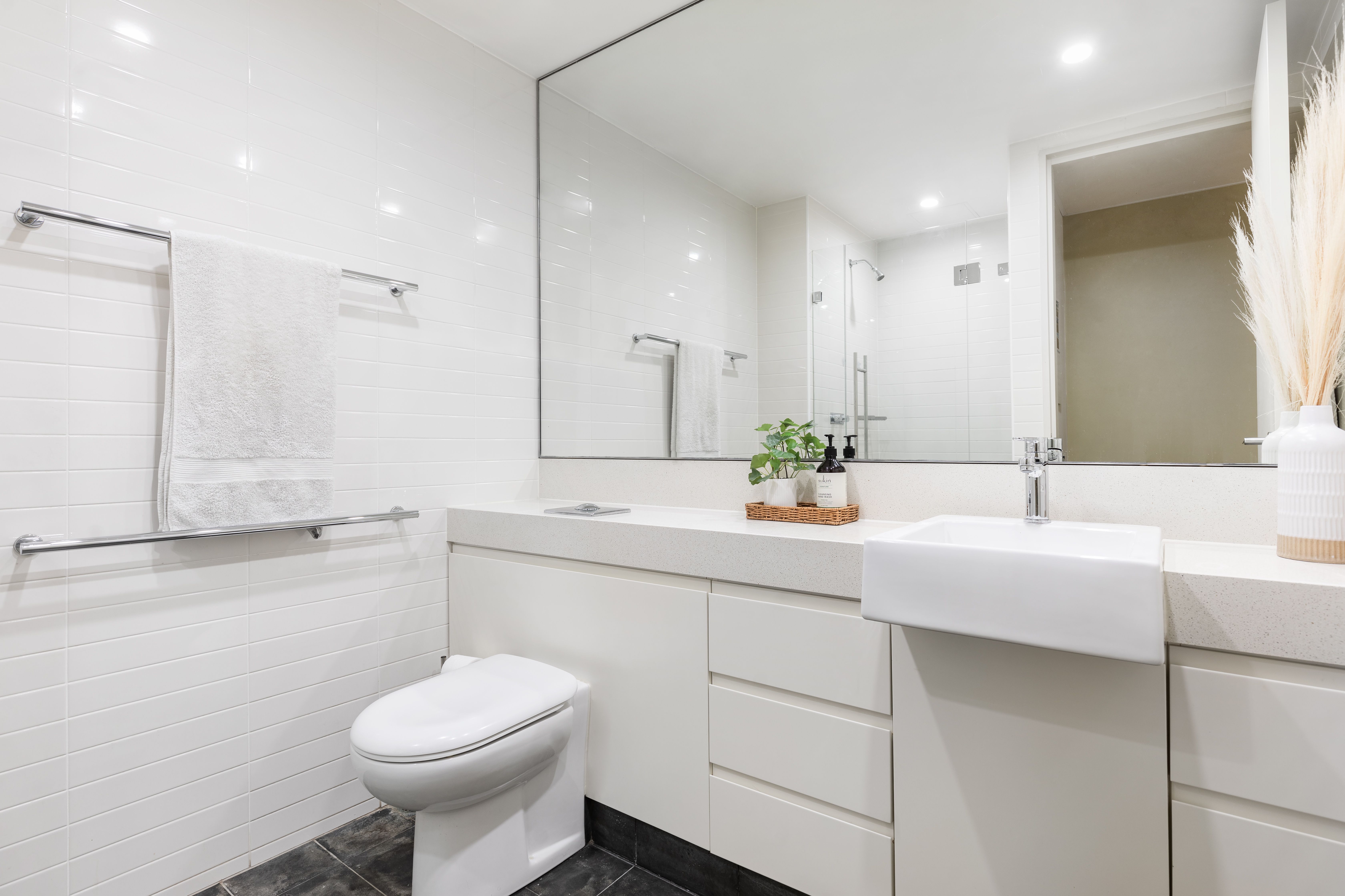 - Easy-care contemporary bathroom with stainless accents
