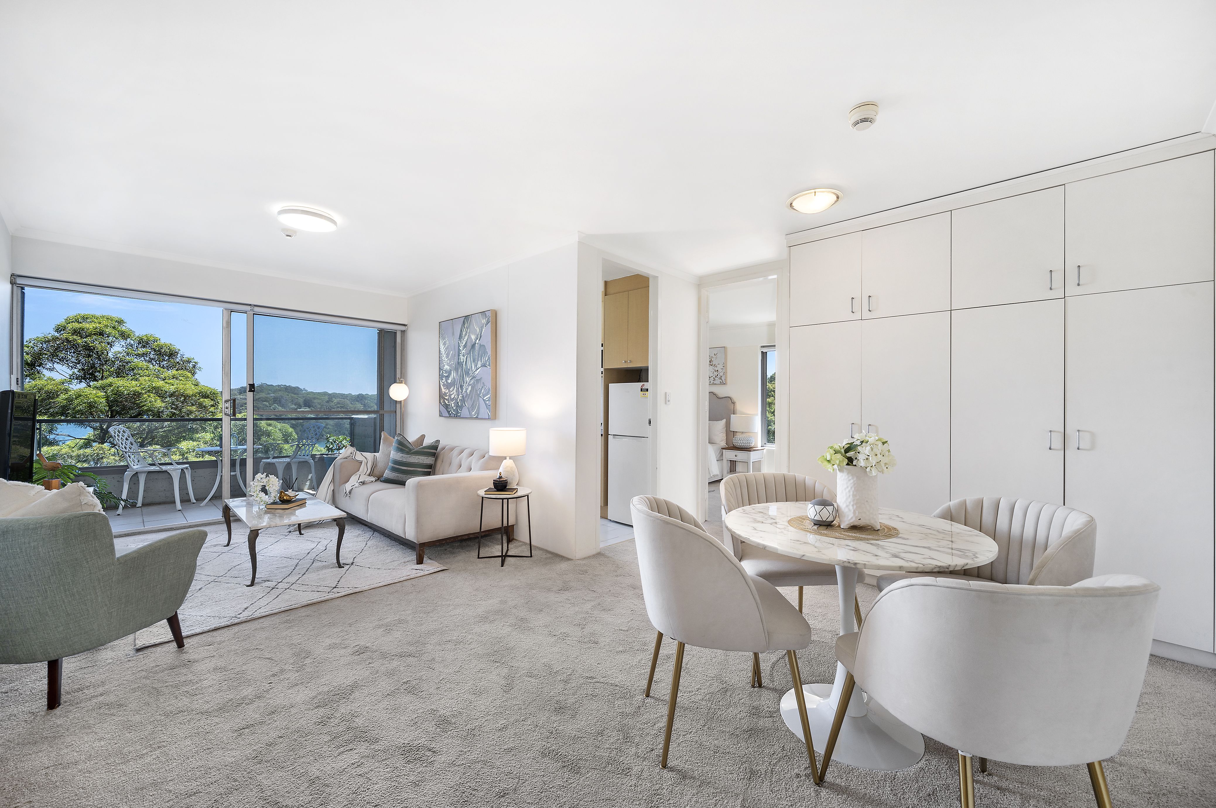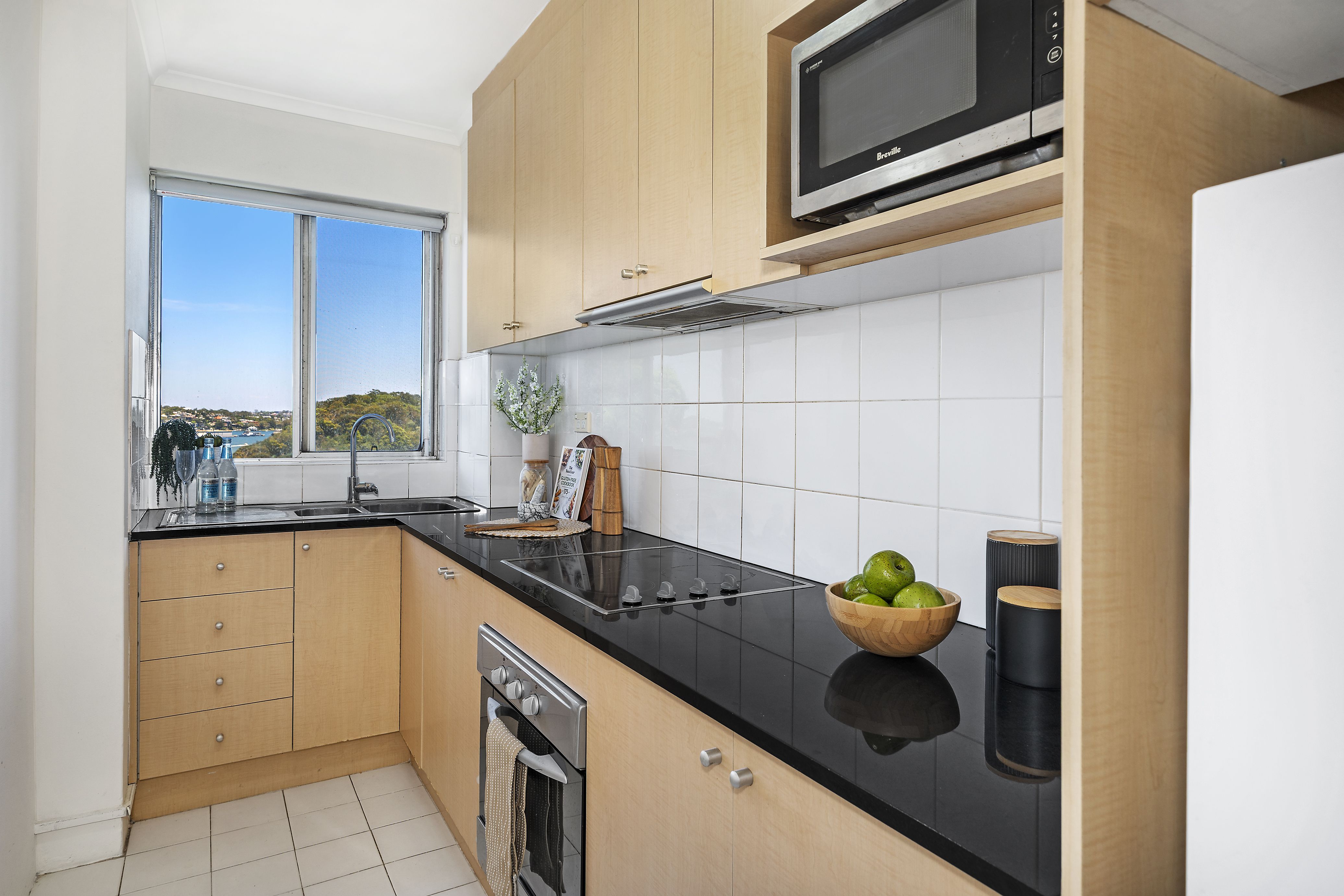 The updated kitchen is well equipped with modern appliances, while the open-plan living and dining area is finished with plush carpet and bright, airy interiors. Living and dining flow to the entertainer’s balcony with sweeping harbour vistas stretching from Berry’s Bay Reserve across to Anzac Bridge and the cityscape, including Crown Sydney. The generous bedroom features built-in robes and stunning harbour views, complemented by a modern renovated bathroom with freestanding shower, washing machine and ample mirrored storage.
