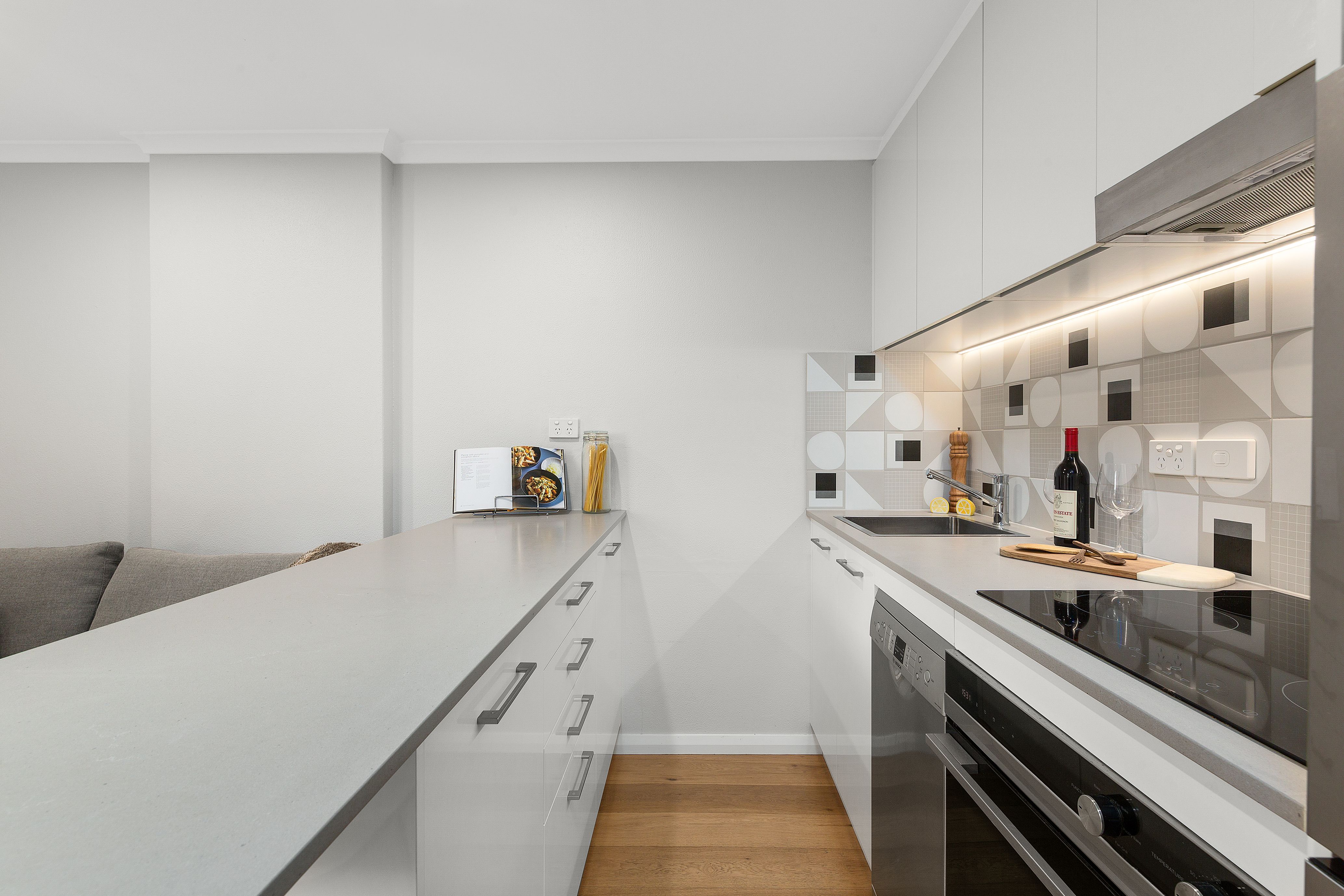 - Kitchen includes Bosch dishwasher, breakfast bar, tiled splashback