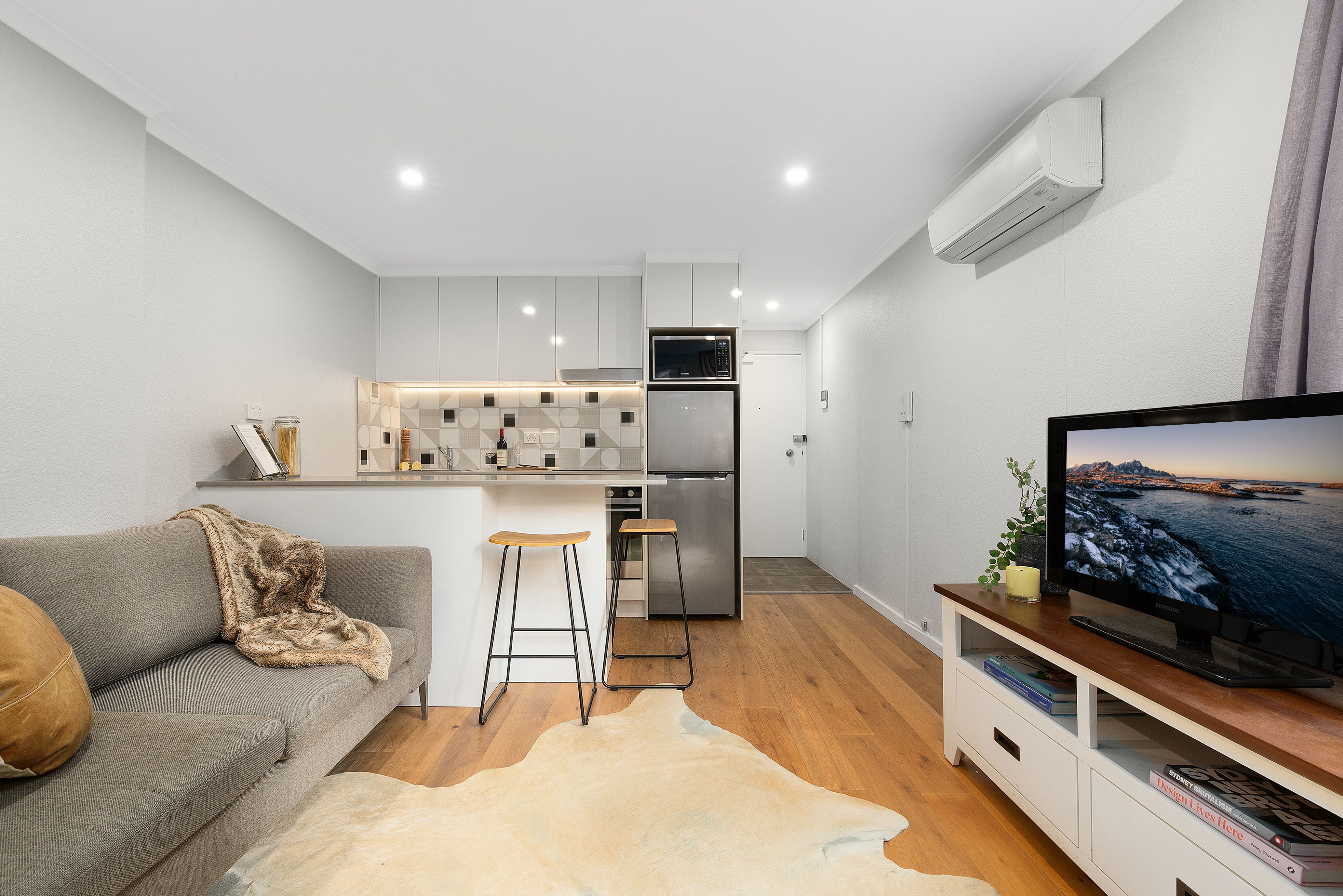 - Light-filled living/dining zone with adjoining galley-style kitchen