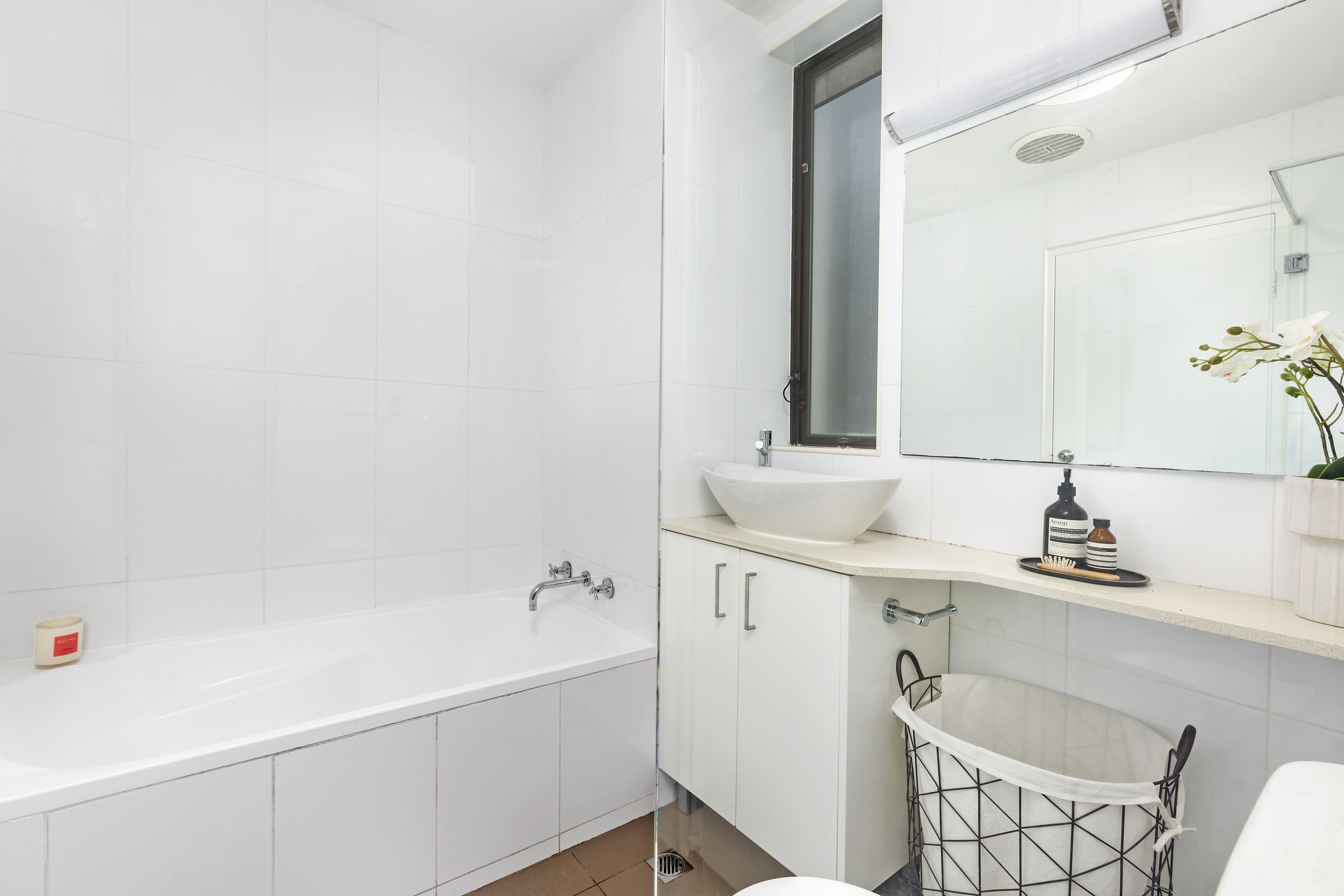 - Light-filled fully tiled main bathroom with a bathtub