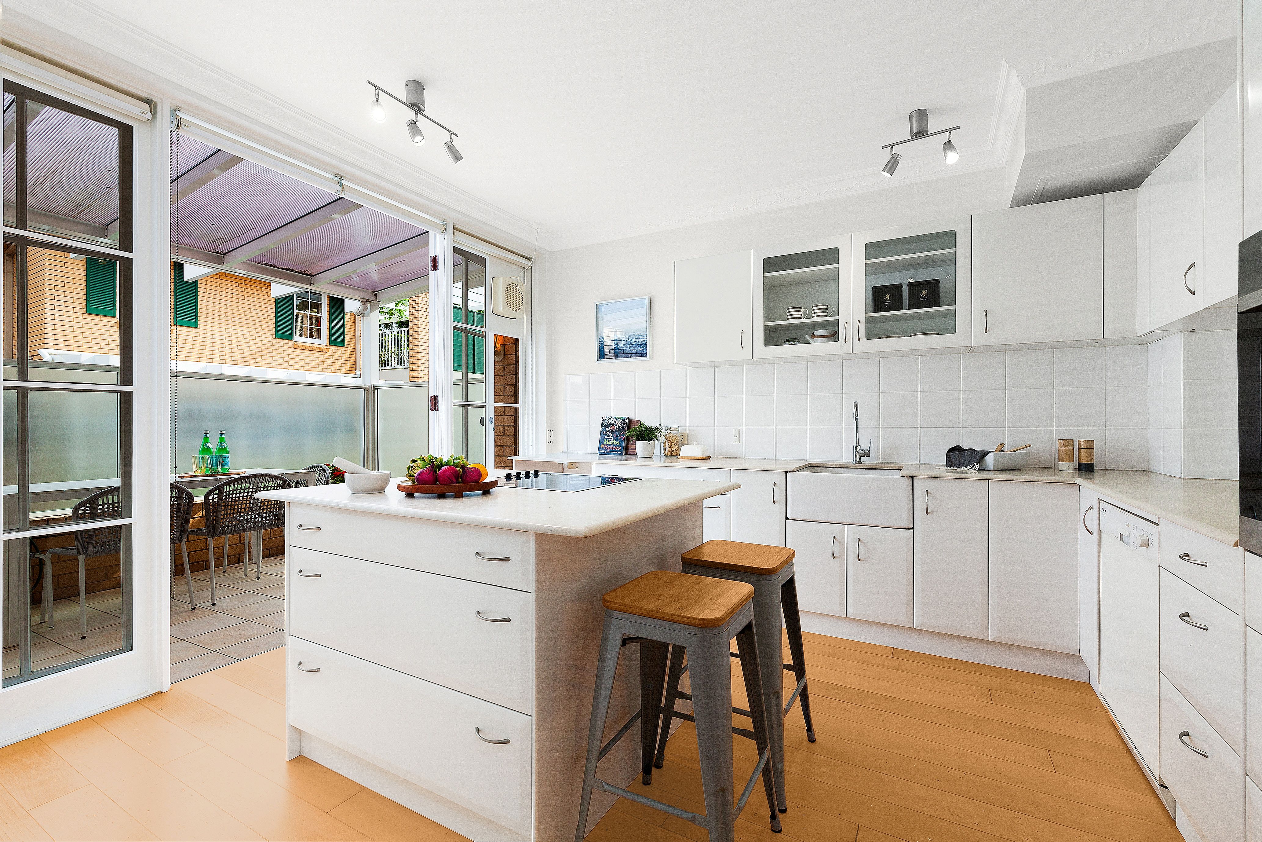 - Large eat-in kitchen with island bench and adjoining breakfast courtyard