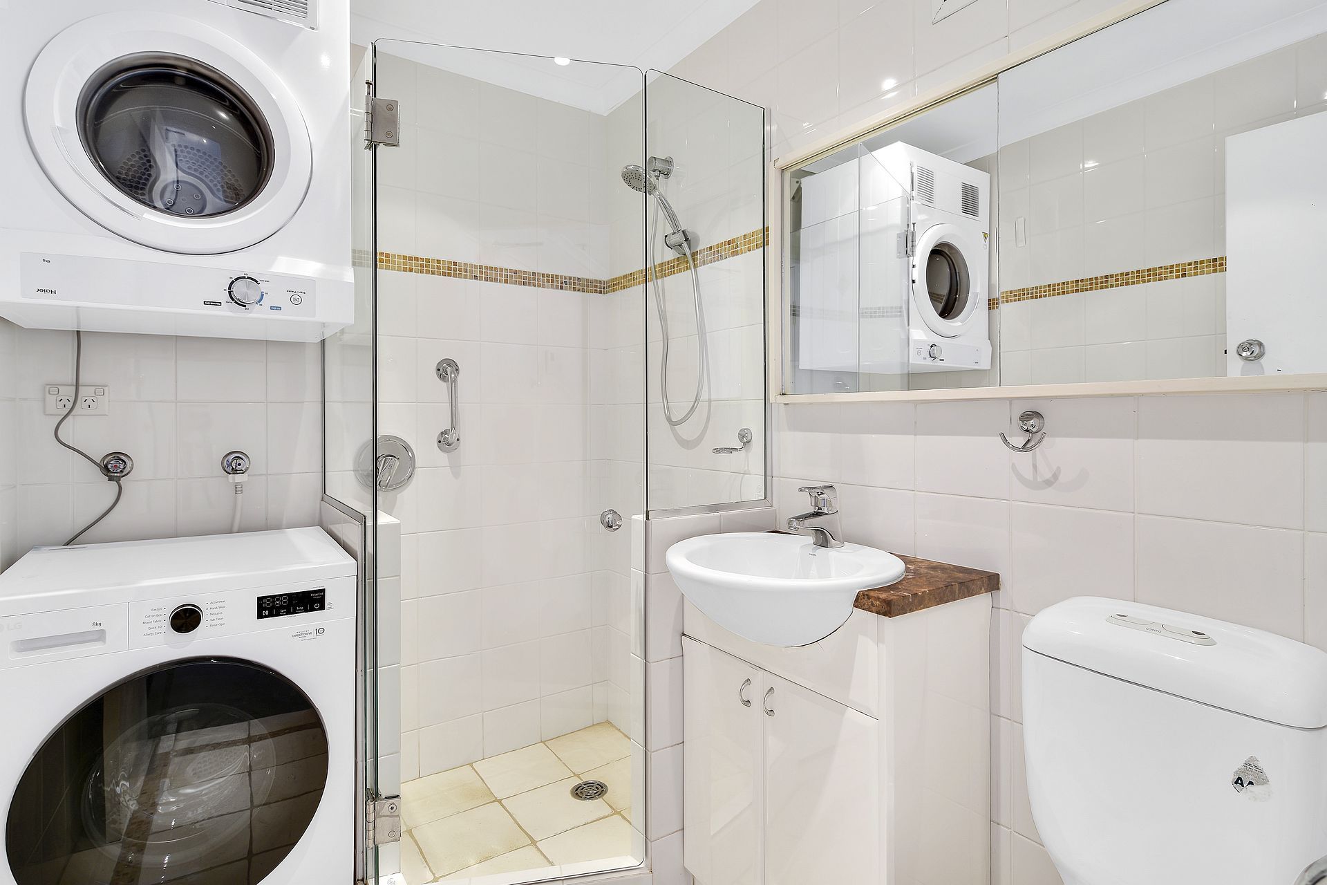 - A modern, sleek bathroom with integrated internal laundry